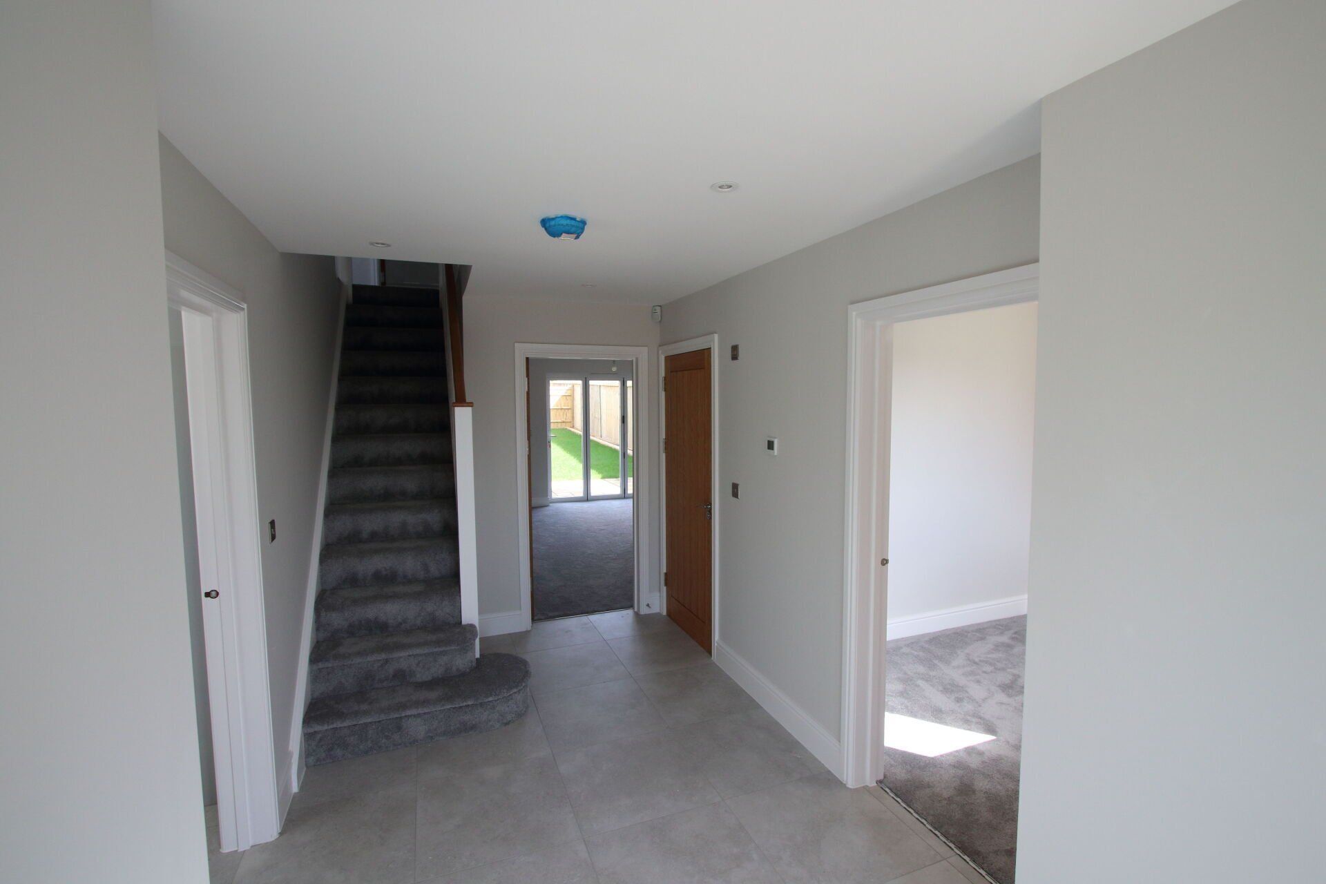 A stunning five bedroom detached home with ample parking for at least three cars on the driveway itself, in addition to a double garage. Four of the bedrooms are double, with two of them featuring fitted wardrobes and en-suite shower room. The remaining bedroom is a generous single. Integrated AEG appliances are included in the kitchen, and the bathroom has Villeroy and Boch Vanity units in contemporary gloss style. Underfloor heating is present throughout the ground level and flooring has been fitted in every room.